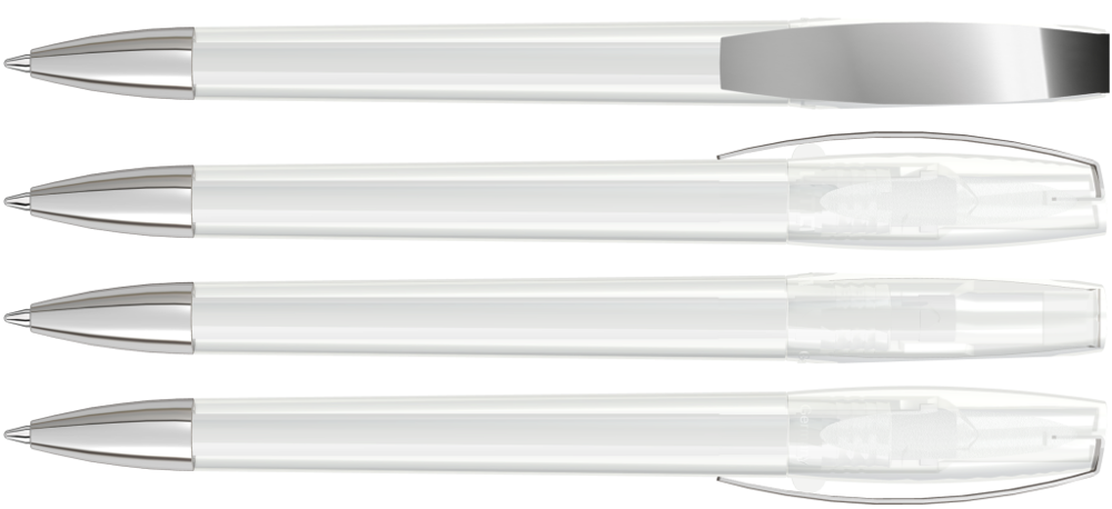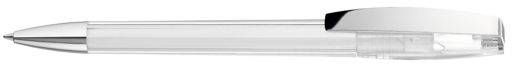 Drehkugelschreiber mit transparent glänzendem Gehäuse. Metallclip und schwere Metallspitze verchromt.
