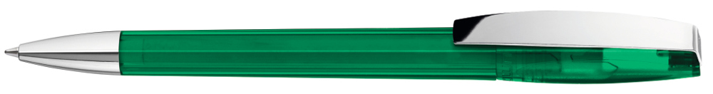 Drehkugelschreiber mit transparent glänzendem Gehäuse. Metallclip und schwere Metallspitze verchromt.