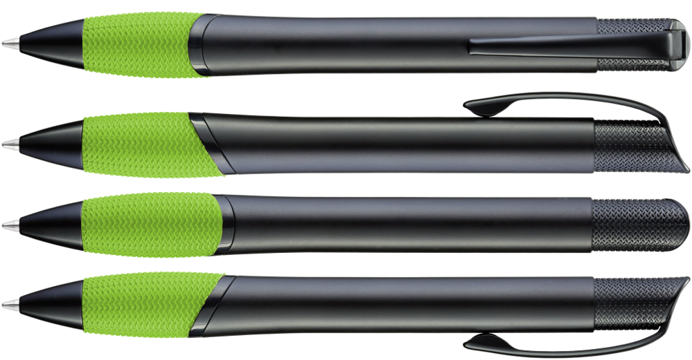 Metall-Druckkugelschreiber mit schwarz matt lackiertem Gehäuse, farbige Gummigriffzone und matt schwarzen Beschlagteilen.