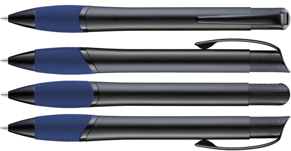 Metall-Druckkugelschreiber mit schwarz matt lackiertem Gehäuse, farbige Gummigriffzone und matt schwarzen Beschlagteilen.