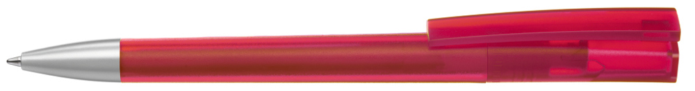 Drehkugelschreiber mit transparent gefrostetem Gehäuse und Stopfen optional in verschiedenen matt gedeckten Farben oder silber erhältlich. Schwere Metallspitze matt verchromt.