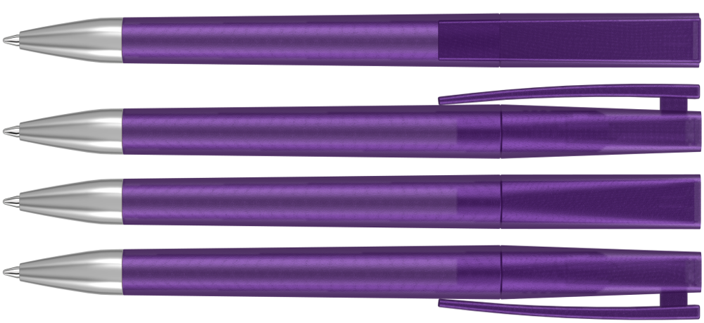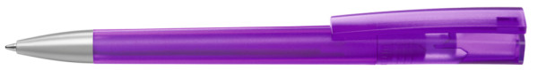 Drehkugelschreiber mit transparent gefrostetem Gehäuse und Stopfen optional in verschiedenen matt gedeckten Farben oder silber erhältlich. Schwere Metallspitze matt verchromt.