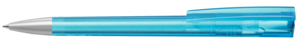 Drehkugelschreiber mit transparent gefrostetem Gehäuse und Stopfen optional in verschiedenen matt gedeckten Farben oder silber erhältlich. Schwere Metallspitze matt verchromt.