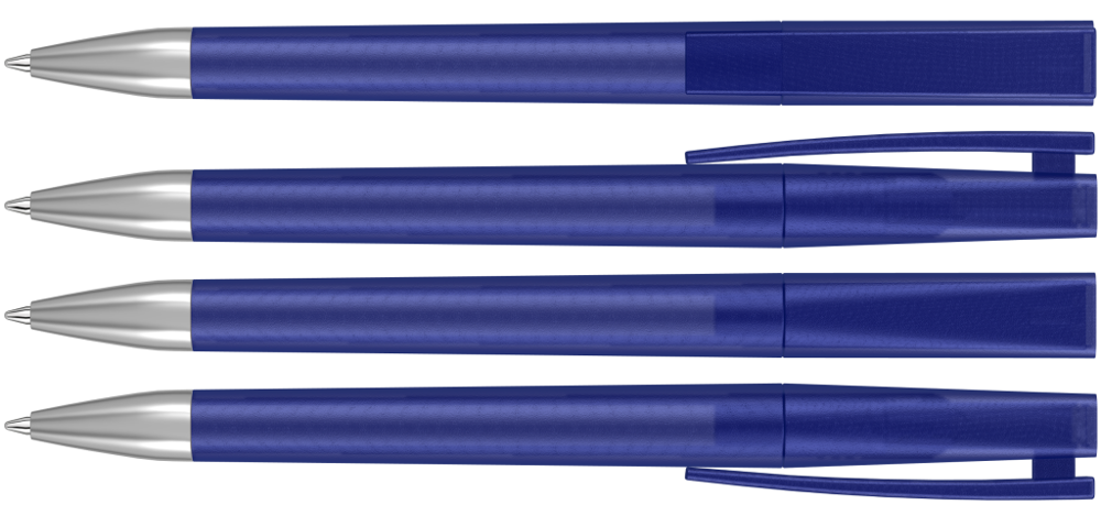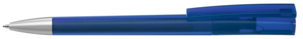 Drehkugelschreiber mit transparent gefrostetem Gehäuse und Stopfen optional in verschiedenen matt gedeckten Farben oder silber erhältlich. Schwere Metallspitze matt verchromt.