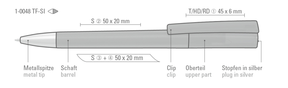 Drehkugelschreiber mit transparent gefrostetem Gehäuse und Stopfen optional in verschiedenen matt gedeckten Farben oder silber erhältlich. Schwere Metallspitze matt verchromt.