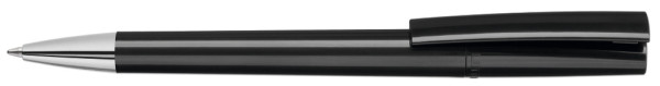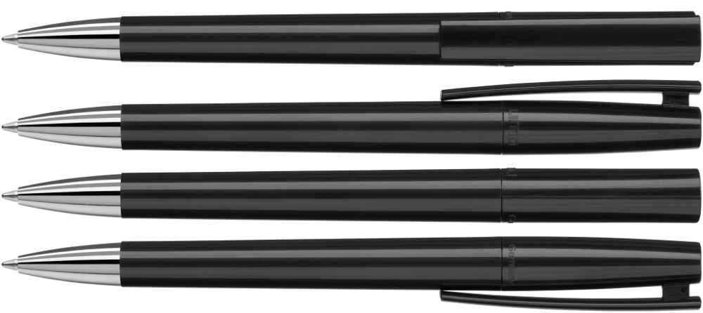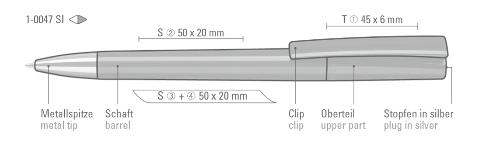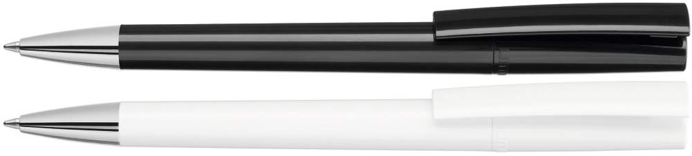 Drehkugelschreiber mit gedeckt glänzendem Gehäuse in weiß oder schwarz und silbernem Stopfen im Oberteil. Schwere Metallspitze glanzverchromt.