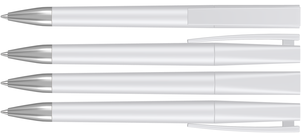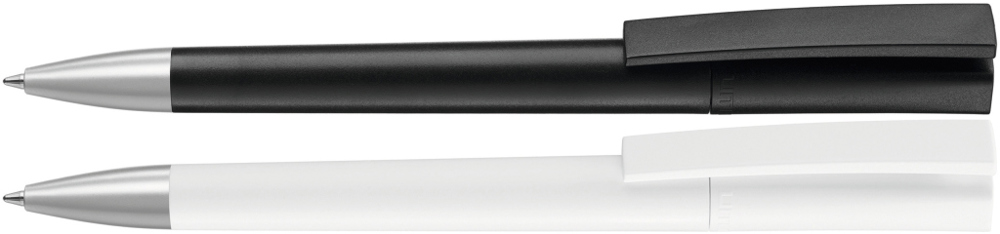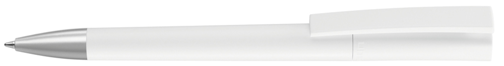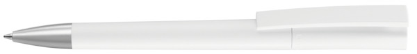 Drehkugelschreiber mit gedeckt mattem Gehäuse in weiß oder schwarz und Stopfen optional in verschiedenen matt gedeckten Farben oder silber erhältlich. Schwere Metallspitze matt verchromt.