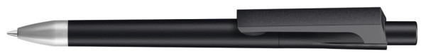 Druckkugelschreiber mit gedeckt mattem Gehäuse und schwerer Metallspitze matt verchromt.