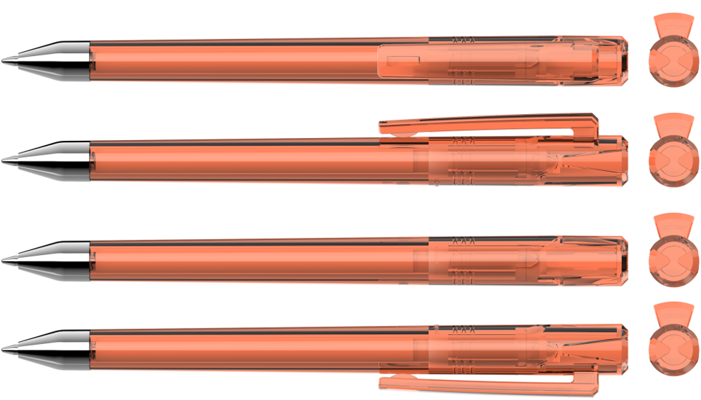 Drehkugelschreiber mit transparent glänzendem Gehäuse und Oberteil mit zwei farbigen Stopfen in gedeckt oder transparent glänzend. Schwere Metallspitze glanzverchromt.