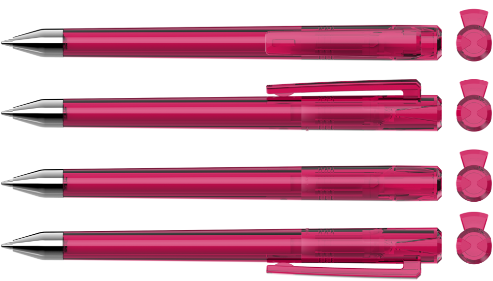 Drehkugelschreiber mit transparent glänzendem Gehäuse und Oberteil mit zwei farbigen Stopfen in gedeckt oder transparent glänzend. Schwere Metallspitze glanzverchromt.