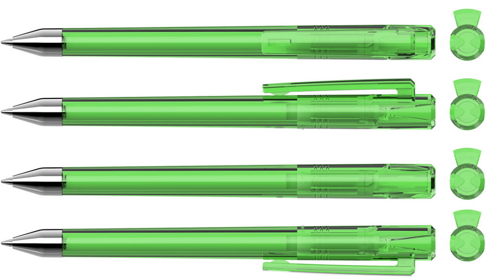 Drehkugelschreiber mit transparent glänzendem Gehäuse und Oberteil mit zwei farbigen Stopfen in gedeckt oder transparent glänzend. Schwere Metallspitze glanzverchromt.