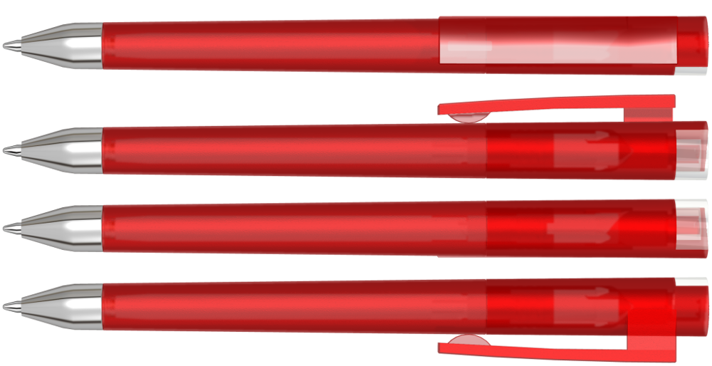 Drehkugelschreiber mit gefrostetem Gehäuse, Clip und Stopfen im Oberteil gedeckt glänzend bzw. transparent glänzend. Schwere Metallspitze glanzverchromt.