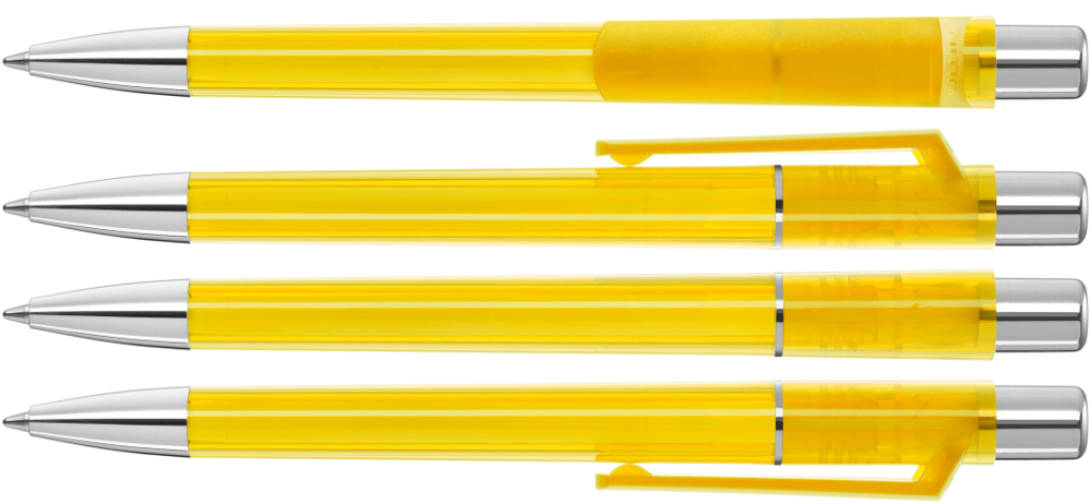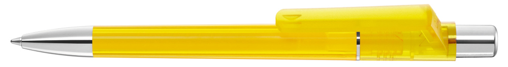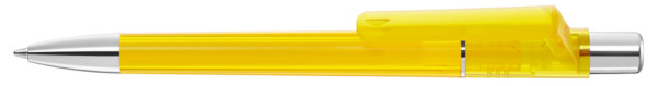 Druckkugelschreiber mit transparent glänzendem Gehäuse, Metallzierring, Drücker und schwere Metallspitze glanzverchromt.