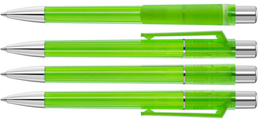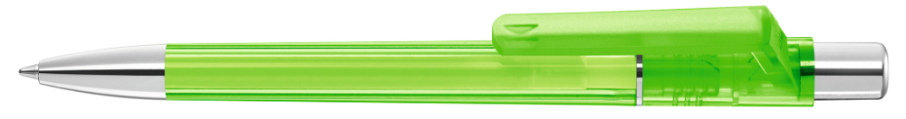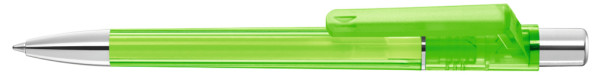Druckkugelschreiber mit transparent glänzendem Gehäuse, Metallzierring, Drücker und schwere Metallspitze glanzverchromt.