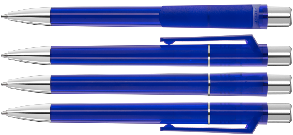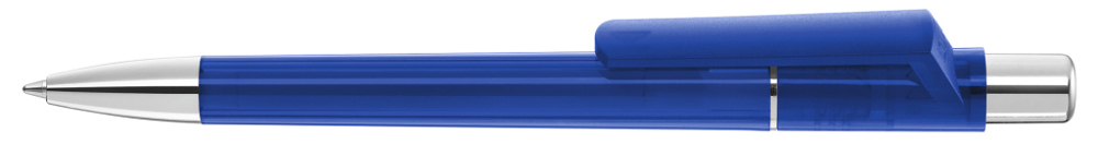Druckkugelschreiber mit transparent glänzendem Gehäuse, Metallzierring, Drücker und schwere Metallspitze glanzverchromt.