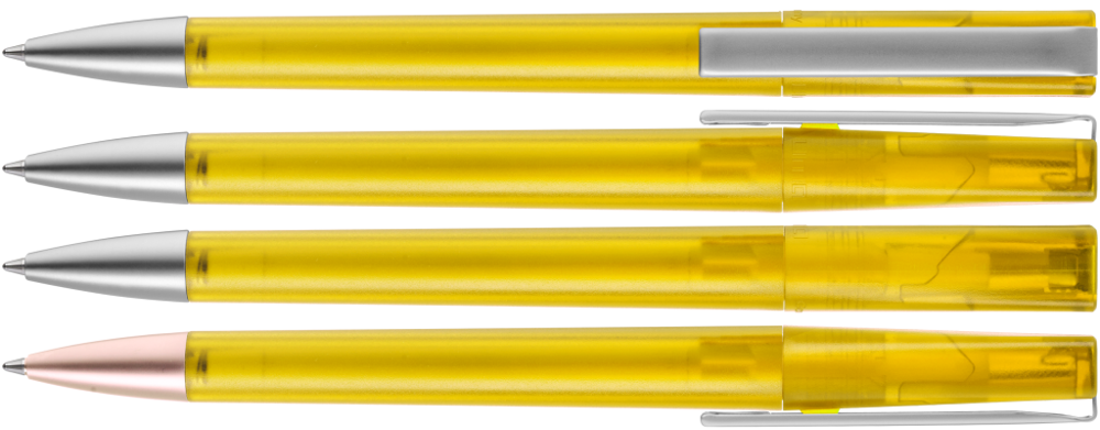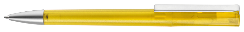 Drehkugelschreiber mit transparent gefrostetem Gehäuse, schwere Metallspitze und Metallclip matt verchromt.