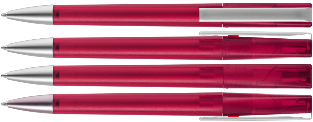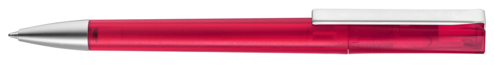 Drehkugelschreiber mit transparent gefrostetem Gehäuse, schwere Metallspitze und Metallclip matt verchromt.