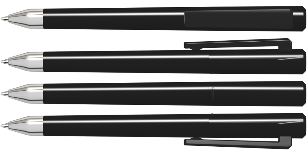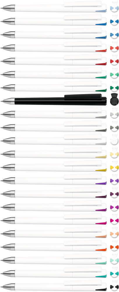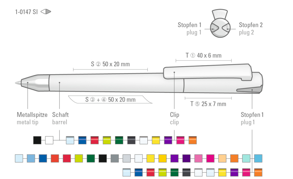 Drehkugelschreiber mit gedeckt glänzendem Gehäuse und Oberteil mit zwei farbigen Stopfen in gedeckt oder transparent. Schwere Metallspitze glanzverchromt.