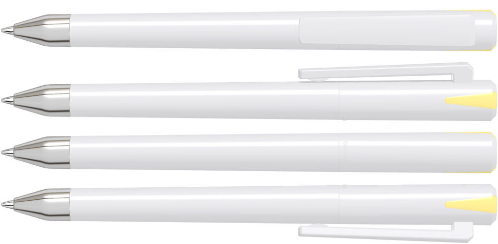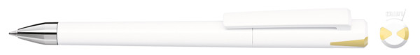 Drehkugelschreiber mit gedeckt glänzendem Gehäuse und Oberteil mit zwei farbigen Stopfen in gedeckt oder transparent. Schwere Metallspitze glanzverchromt.