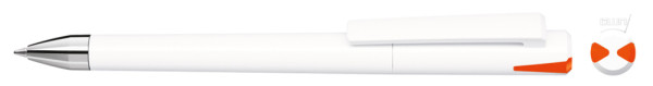 Drehkugelschreiber mit gedeckt glänzendem Gehäuse und Oberteil mit zwei farbigen Stopfen in gedeckt oder transparent. Schwere Metallspitze glanzverchromt.