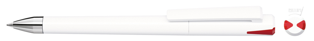 Drehkugelschreiber mit gedeckt glänzendem Gehäuse und Oberteil mit zwei farbigen Stopfen in gedeckt oder transparent. Schwere Metallspitze glanzverchromt.