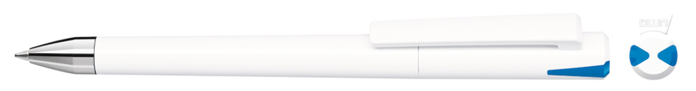 Drehkugelschreiber mit gedeckt glänzendem Gehäuse und Oberteil mit zwei farbigen Stopfen in gedeckt oder transparent. Schwere Metallspitze glanzverchromt.