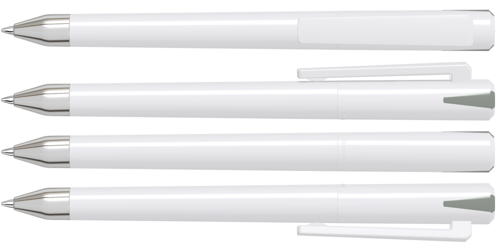 Drehkugelschreiber mit gedeckt glänzendem Gehäuse und Oberteil mit zwei farbigen Stopfen in gedeckt oder transparent. Schwere Metallspitze glanzverchromt.