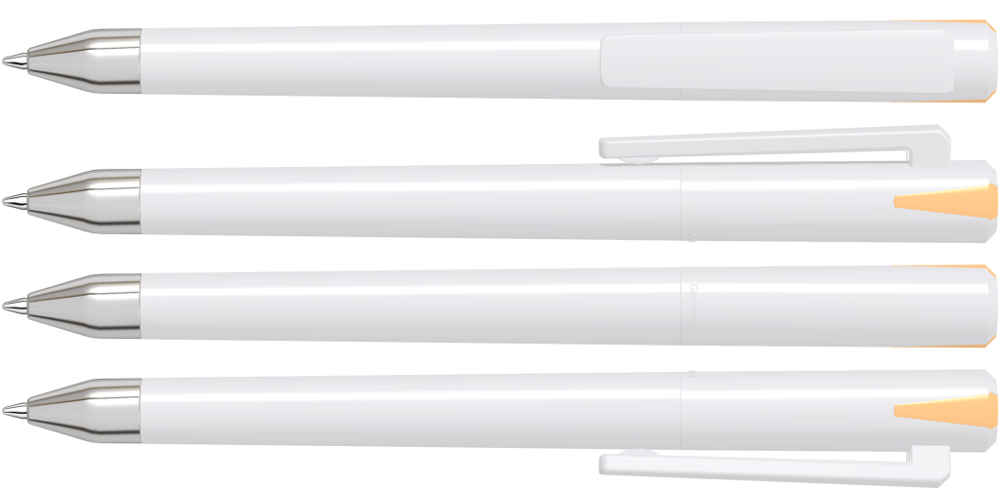 Drehkugelschreiber mit gedeckt glänzendem Gehäuse und Oberteil mit zwei farbigen Stopfen in gedeckt oder transparent. Schwere Metallspitze glanzverchromt.