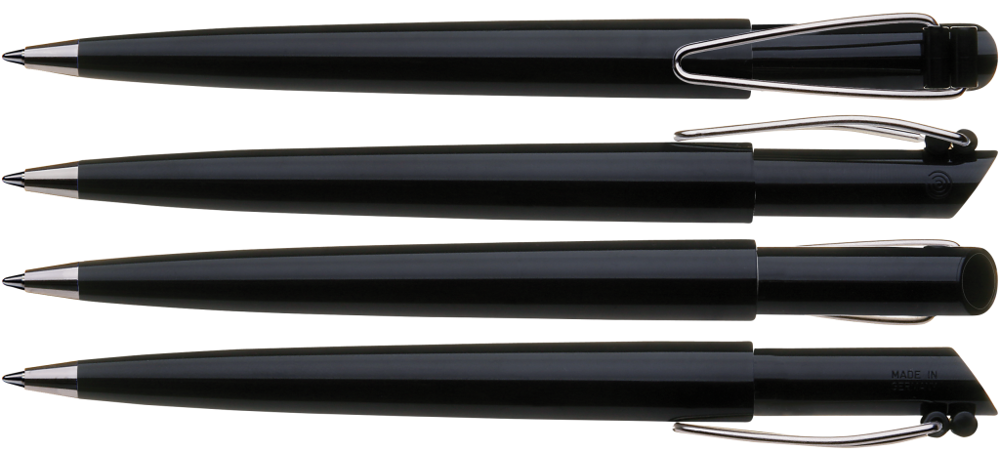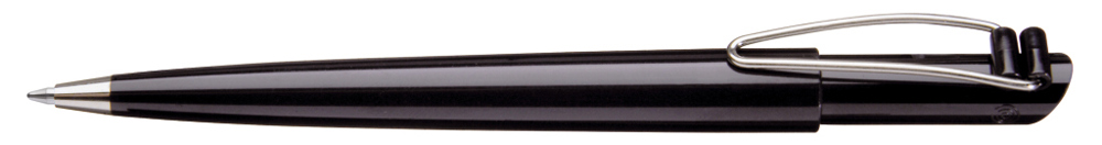 Druckkugelschreiber mit gedeckt glänzendem Gehäuse, vernickeltem Metallbiegeclip und Metallspitze.