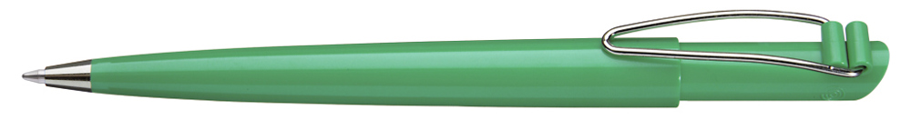 Druckkugelschreiber mit gedeckt glänzendem Gehäuse, vernickeltem Metallbiegeclip und Metallspitze.