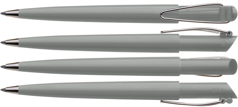 Druckkugelschreiber mit gedeckt glänzendem Gehäuse, vernickeltem Metallbiegeclip und Metallspitze. mehr