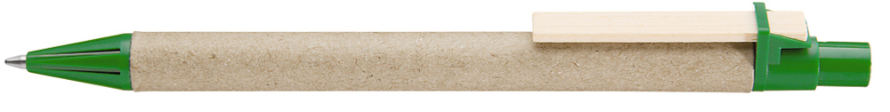 Druckkugelschreiber aus recycelter, naturfarbener Pappe. Spitze und Drücker unifarben aus recyceltem oder biologisch abbaubarem Kunststoff (*06-7527 Bio-Mix) sowie Holzclip.