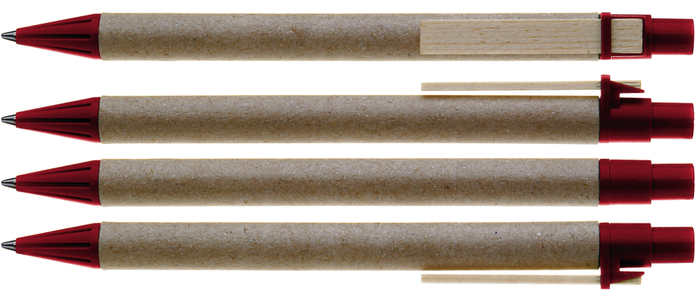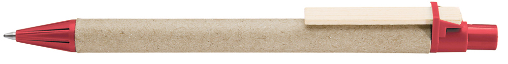Druckkugelschreiber aus recycelter, naturfarbener Pappe. Spitze und Drücker unifarben aus recyceltem oder biologisch abbaubarem Kunststoff (*06-7527 Bio-Mix) sowie Holzclip.