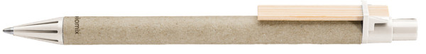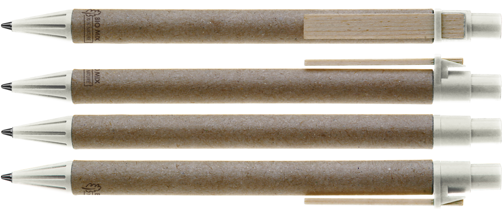 Druckkugelschreiber aus recycelter, naturfarbener Pappe. Spitze und Drücker unifarben aus recyceltem oder biologisch abbaubarem Kunststoff (*06-7527 Bio-Mix) sowie Holzclip.