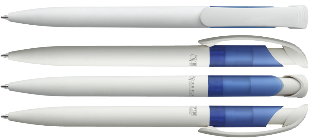 Druckkugelschreiber mit Gehäuse und Clip aus 100% nachwachsendem und kompostierbarem Material. Oberteil aus gefrostetem ABS Kunststoff.