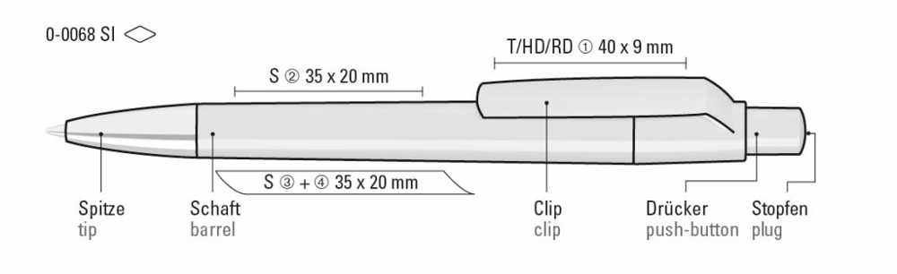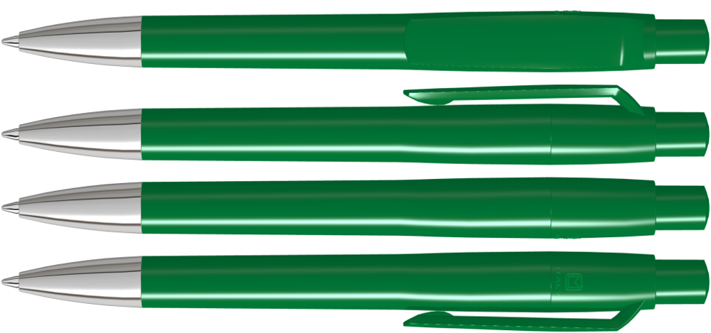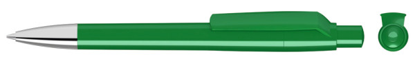 Druckkugelschreiber mit gedeckt glänzendem Gehäuse, Clip, Drücker und Stopfen. Spitze glanzverchromt.