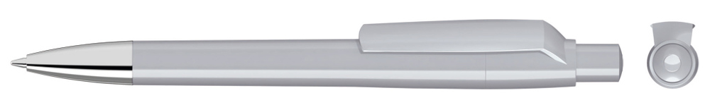 Druckkugelschreiber mit gedeckt glänzendem Gehäuse, Clip, Drücker und Stopfen. Spitze glanzverchromt.