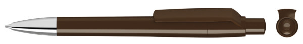Druckkugelschreiber mit gedeckt glänzendem Gehäuse, Clip, Drücker und Stopfen. Spitze glanzverchromt.