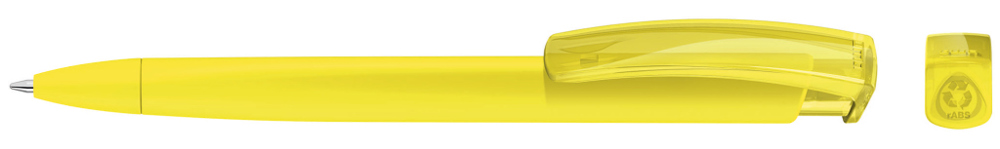 Druckkugelschreiber mit gedeckt mattem Dreikantgehäuse und transparent glänzendem Clip aus recyceltem ABS Kunststoff. Das Modell ist mit dem Recyclingzeichen gekennzeichnet.