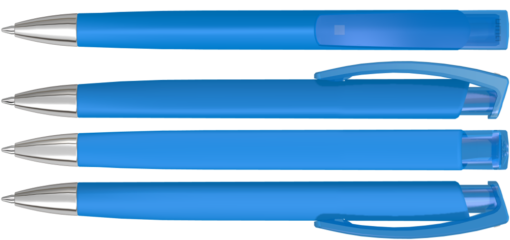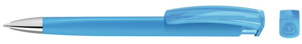 Druckkugelschreiber mit gedeckt mattem Dreikantgehäuse, transparent glänzendem Clip aus recyceltem ABS Kunststoff und schwerer Metallspitze glanzverchromt. Das Modell ist mit dem Recyclingzeichen gekennzeichnet.