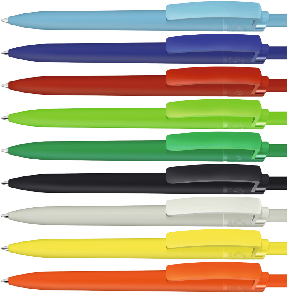 Druckkugelschreiber mit gummiertem Gehäuse aus recyceltem PET-Material mit matt gedecktem Clip und Drücker.
