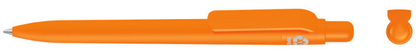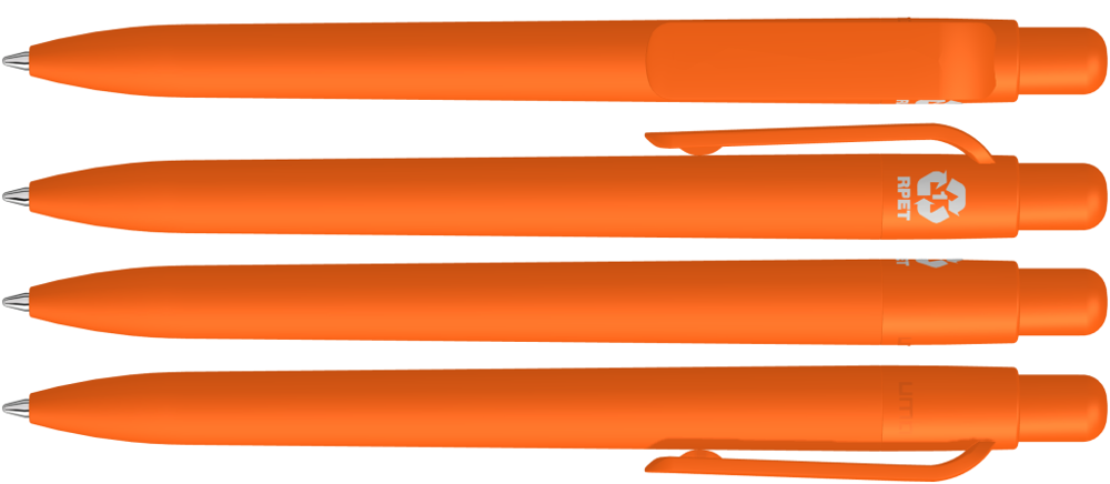 Druckkugelschreiber aus recyceltem PET-Material mit gummiertem Gehäuse und gedeckt mattem Clip, Drücker und Stopfen.