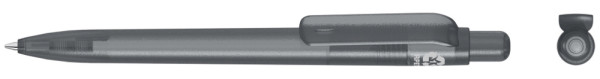 Druckkugelschreiber aus recyceltem PET-Material mit transparent gefrostetem Gehäuse, Clip, Drücker und Stopfen.