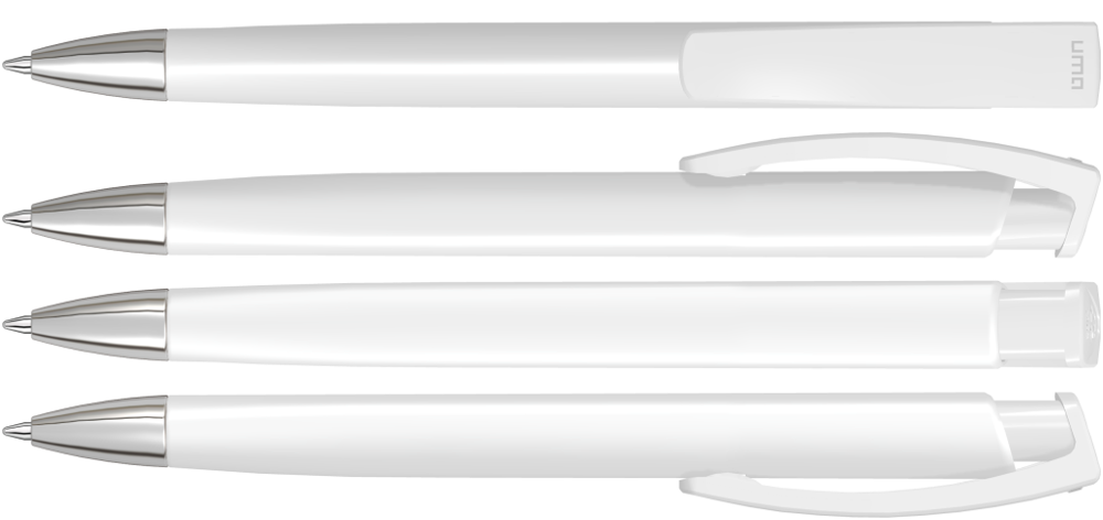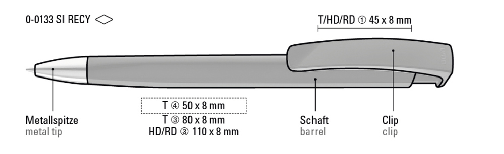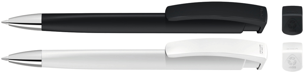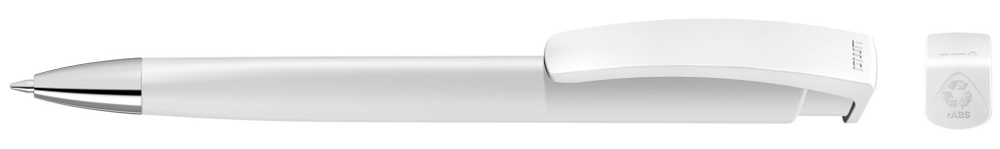 Druckkugelschreiber mit gedeckt mattem Dreikantgehäuse und glänzendem Clip aus recyceltem ABS Kunststoff, schwere Metallspitze glanzverchromt. Das Modell ist mit dem Recyclingzeichen gekennzeichnet.