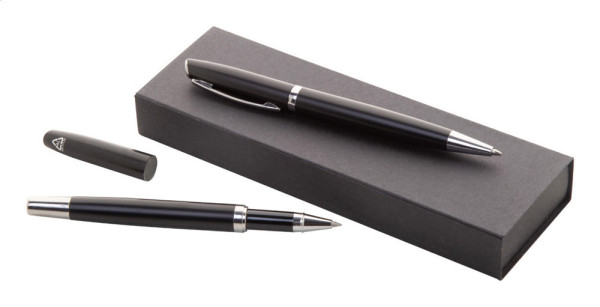 Stiftset aus recyceltem Aluminium mit Rollerball und Kugelschreiber in schwarzer Geschenkbox aus Papier, blauschreibend.