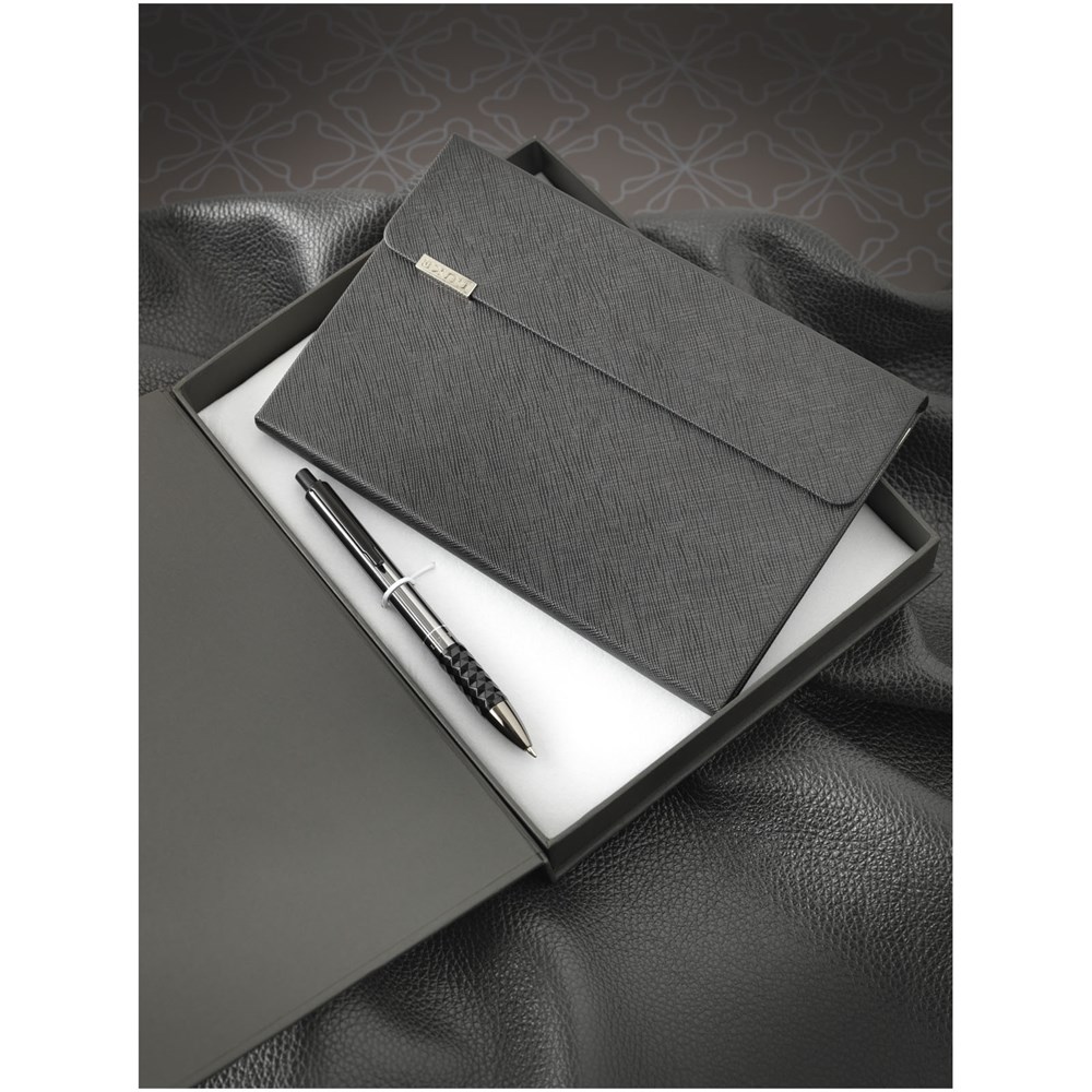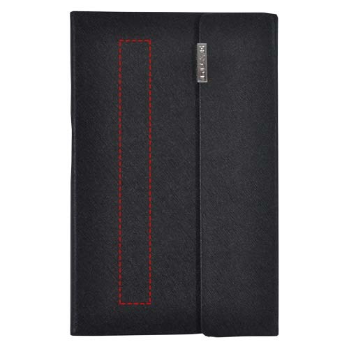 Notizbuch in exklusivem Design (A5-Referenz) mit Thermo-PU-Einband, schwarzem Band-Lesezeichen, Magnetverschluss und 80 Blatt (80 g/m2) cremefarbenem, liniertem Papier. Gepaart mit dem Tactical Druckkugelschreiber. Beide Artikel sind in einer „LUXE“-Präsentschachtel verpackt. Größe des Notizbuches: 13,5 x 20,5 cm. Länge des Stiftes: 14 cm. Durchmesser des Stiftes: 1,05 cm.