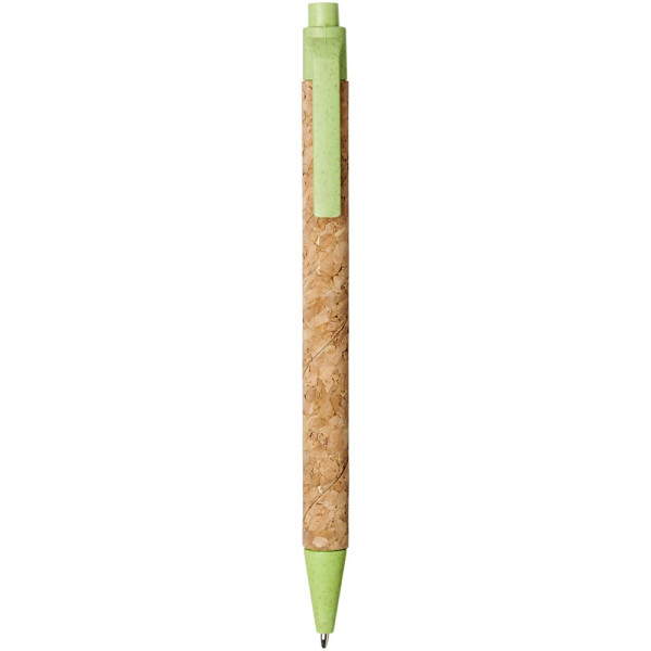 Umweltfreundlicher Kugelschreiber mit Klickmechanismus, Korkgriff und Weizenstrohverzierungen in verschiedenen Farben. Bei Weizenstroh handelt es sich um zurückgebliebene Stiele nach der Ernte von Weizenkörnern. Dadurch wird die Menge an Kunststoff reduziert und eine umweltfreundliche Alternative geschaffen. Die Farbe des Korkmaterials kann variieren.