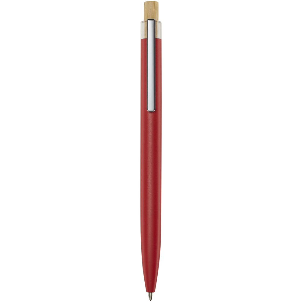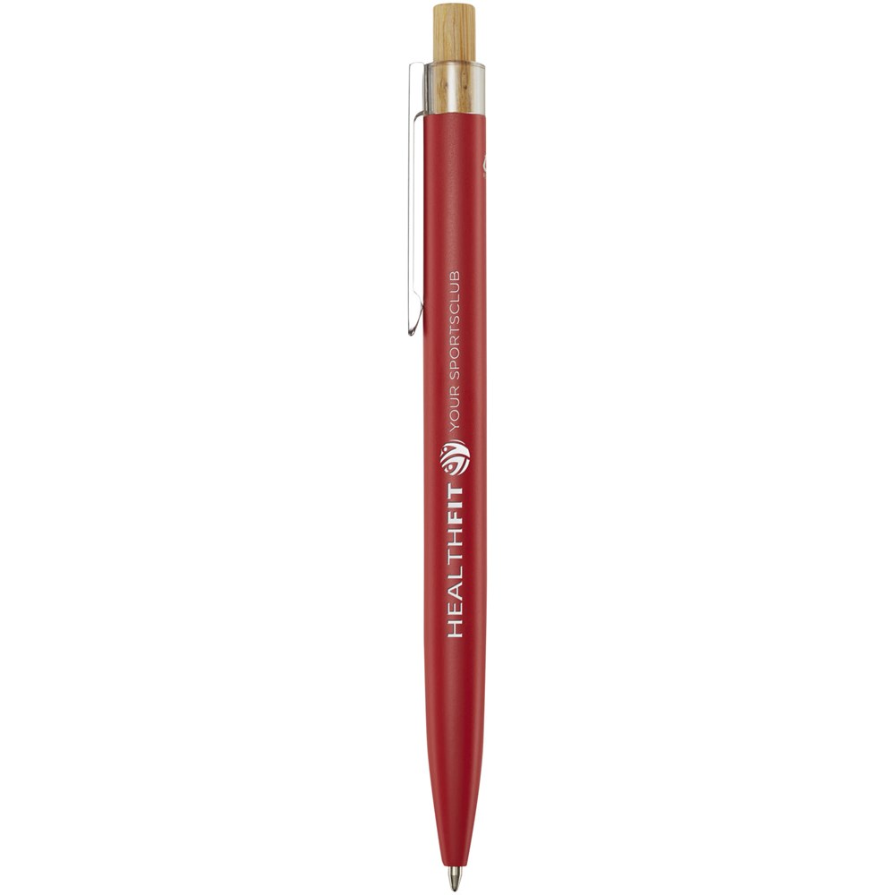 Der Nooshin Kugelschreiber wird aus recyceltem Aluminium hergestellt, was weniger Energie benötigt als die Herstellung von Aluminium aus Rohstoffen. Es reduziert außerdem die Abfallmenge auf Mülldeponien und trägt dazu bei, natürliche Ressourcen zu schonen und Treibhausgasemissionen zu reduzieren. Druckknopf ist aus Bambus gefertigt. Tintenfarbe: Blau. Schreiblänge: 800 Meter. Spitzengröße: 1,00 mm.