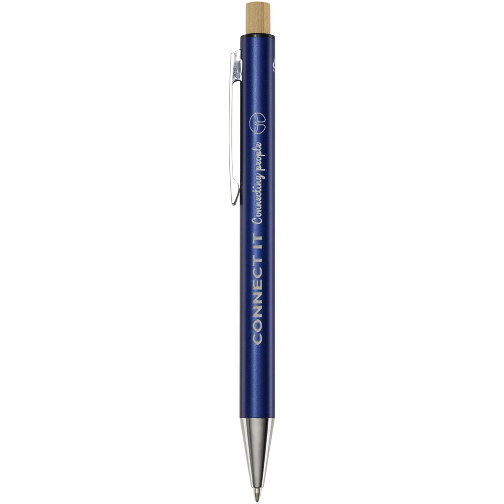 Der Cyrus Kugelschreiber ist aus recyceltem Aluminium hergestellt, was weniger Energie benötigt als die Herstellung von Aluminium aus Rohstoffen. Es reduziert außerdem die Abfallmenge auf Mülldeponien und trägt dazu bei, natürliche Ressourcen zu schonen und Treibhausgasemissionen zu reduzieren. Druckknopf ist aus Bambus gefertigt. Tintenfarbe: Blau. Schreiblänge: 800 Meter. Spitzengröße: 1,00 mm.
