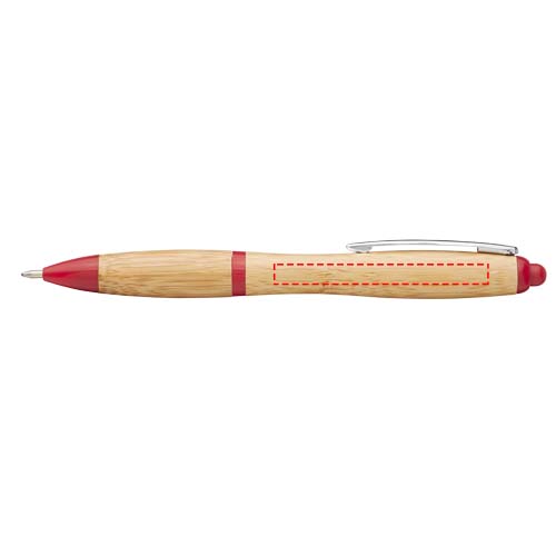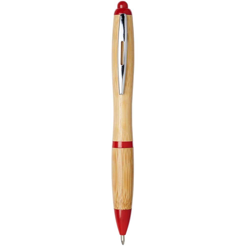 Kugelschreiber mit Klickmechanismus, mit einem Schaft aus Bambus, akzentuiert durch einen verchromten Clip und Verzierungen aus ABS-Kunststoff. Die Farbe des Bambusmaterials kann variieren.